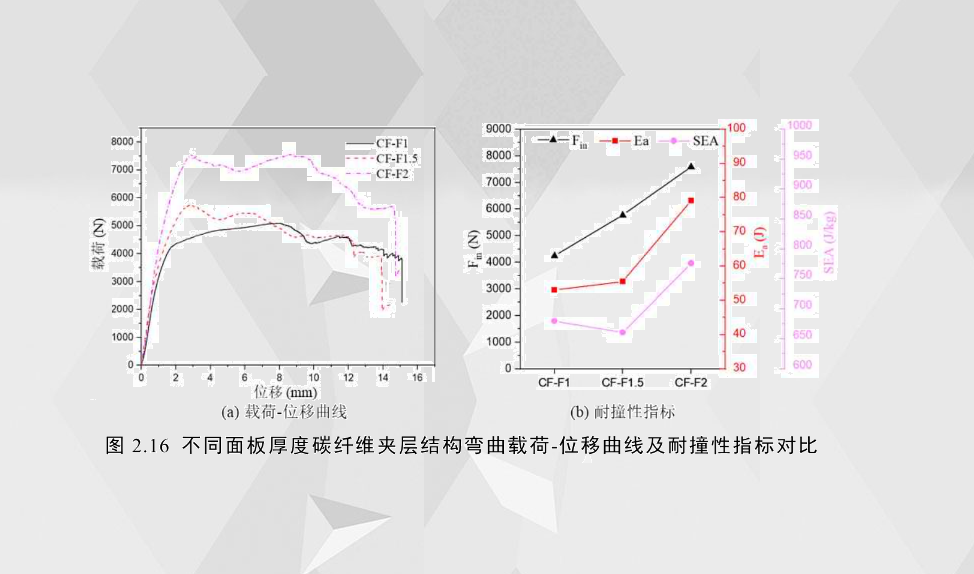 圖2.16(a)比較了不同面板厚度碳纖維夾層結(jié)構(gòu)的載荷-位移曲線,可以發(fā)現(xiàn),CF-F1的載荷-位移曲線屬于曲線類(lèi)型Ⅲ,而其臨界失效模式為壓痕壓入(IN);由于碳纖維在拉伸過(guò)程沒(méi)有明顯的塑性變形,當(dāng)其開(kāi)始失效時(shí),后續(xù)載荷的變化趨勢(shì)與臨界載荷為IN的鋁合金夾層結(jié)構(gòu)有一定的差異,CF-F1開(kāi)始失效時(shí),載荷并沒(méi)有下降,只是增加的幅度大大地減少。CF-F1.5和CF-F2的臨界失效模式為芯層剪切失效(CS),二者達(dá)到臨界載荷之后載荷有所降低,兩者的載荷-位移曲線屬于類(lèi)型IV。與CF-F2不同的是,CF-F1和CF-F1.5其后期壓潰力的大小變化趨勢(shì)相對(duì)平緩。試件整體斷裂前(14-16mm處)的變形模式主要存在芯層泡沫壓縮、剪切裂紋和界面失效,隨著位移的增加,面板纖維發(fā)生斷裂,試件失去承載能力。