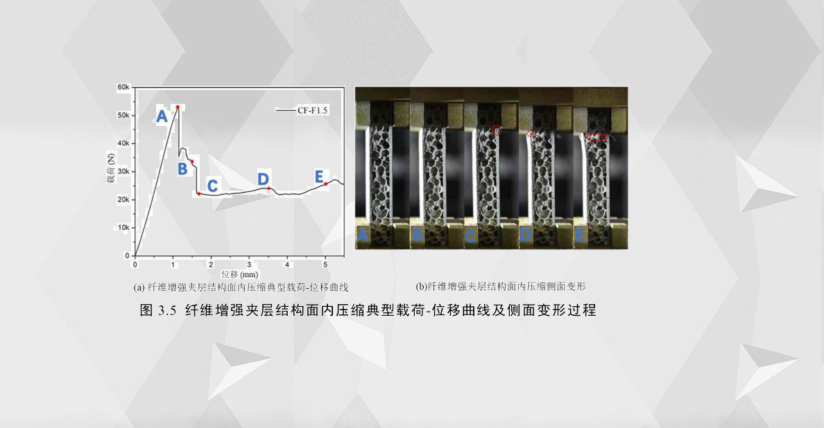對于面板為纖維增強(qiáng)復(fù)合材料(碳纖維和玻璃纖維)的夾層結(jié)構(gòu)而言,其載荷-位移曲線和變形/失效與鋁合金夾層結(jié)構(gòu)的有很大的差異。以面板厚度約1.5mm 的碳纖維夾層結(jié)構(gòu)為例,其載荷-位移曲線大致可以分成兩個階段,如圖3.5(a)所示,第一階段為彈性階段O-A,與鋁合金夾層結(jié)構(gòu)的曲線第一階段相似,載荷隨位移的增加而基本呈線性增長;第二階段為A點(diǎn)之后,隨著壓潰位移的增加,碳纖維面板發(fā)生脆性斷裂,導(dǎo)致載荷發(fā)生斷崖式下降,由于加載位移較小,芯層泡沫未發(fā)生嚴(yán)重的破壞,使得纖維增強(qiáng)夾層結(jié)構(gòu)仍具有一定的承載能力。